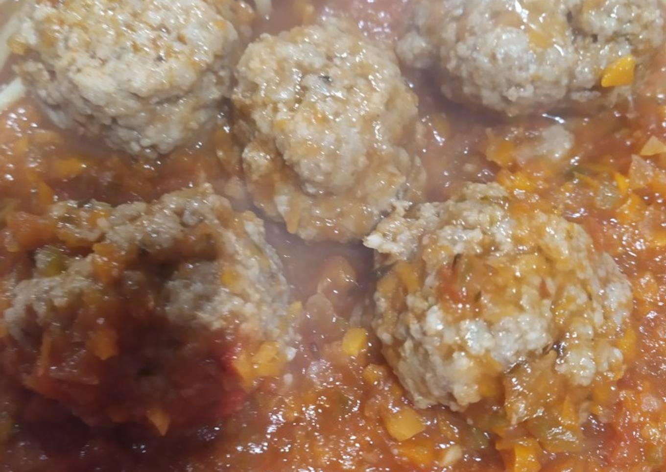 - Luego en una olla hacemos una salsa a elecci贸n (en mi caso eleg铆 portuguesa salsa de tomate+cebolla +morr贸n +verdeo) y una vez que hierva le agregamos las alb贸ndigas hasta que se cocinen