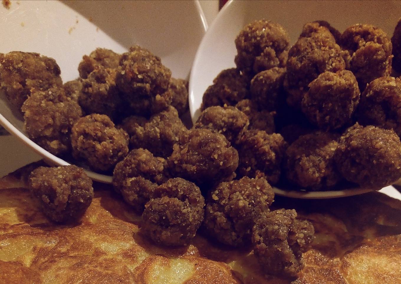 - Coloco.todos los ingredientes juntos mezclo con un tenedor y amaso la preparación. Separo entre trocitos y armo las albóndigas.