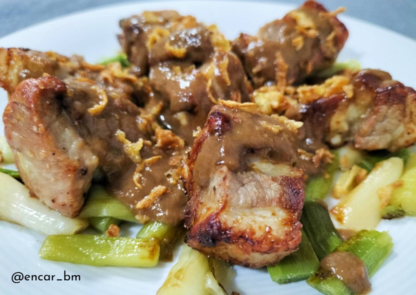 Costillas en airfryer con salsa de vino chocolate y ajos tiernos