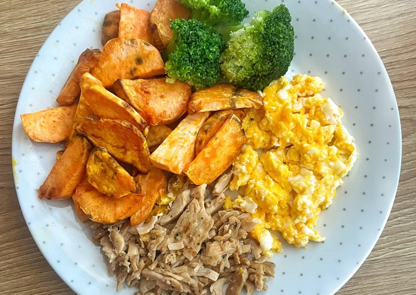 Plato combinado de pollo, huevo, br贸coli y boniato en airfryer 馃崡馃ウ馃崰馃