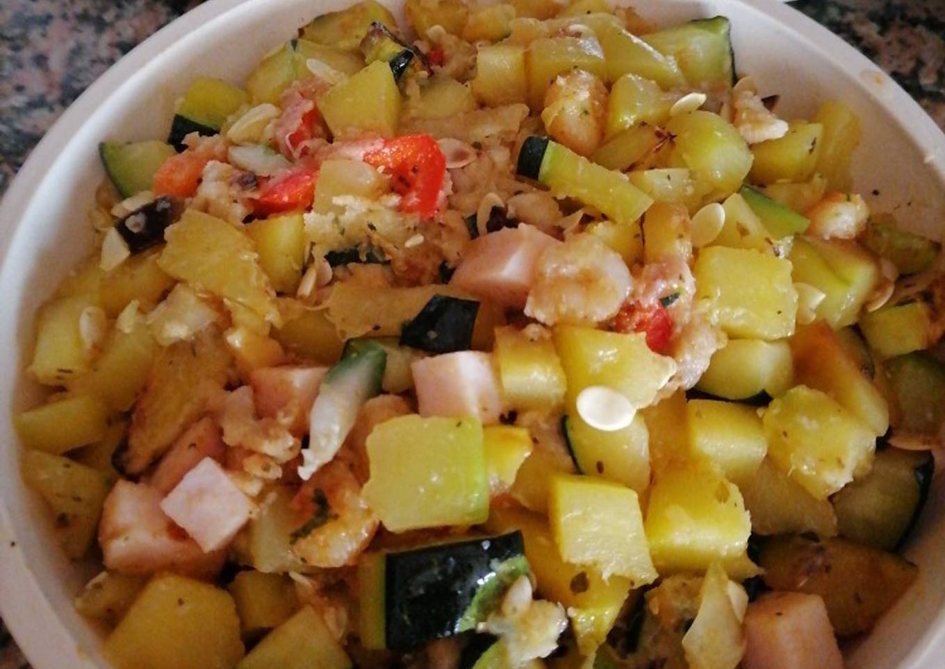 - Ponemos en el airfryer el calabacín a 200ºC durante 20 minutos, sazonado y cuando queden unos 6-7 minutos paramos la freidora y añadimos la verdura en tempura y el pavo. Seguimos cocinando y listo para servir con la gambas al pilpil todo mezclado.