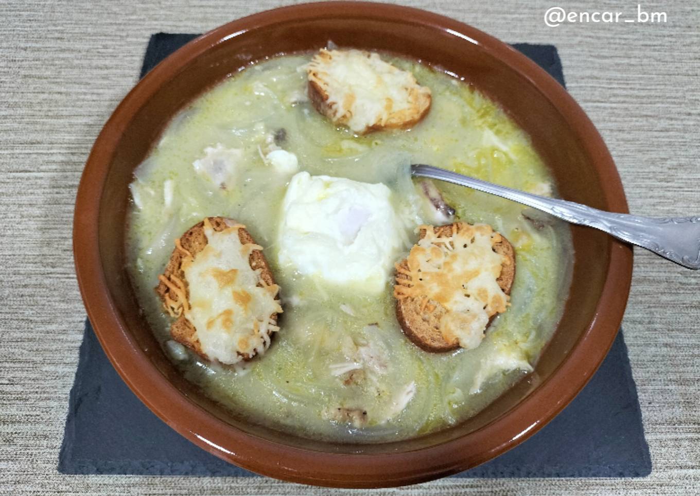 Es la típica sopa de cebolla, pero he añadido pollo y huevo, y no le he puesto vino.